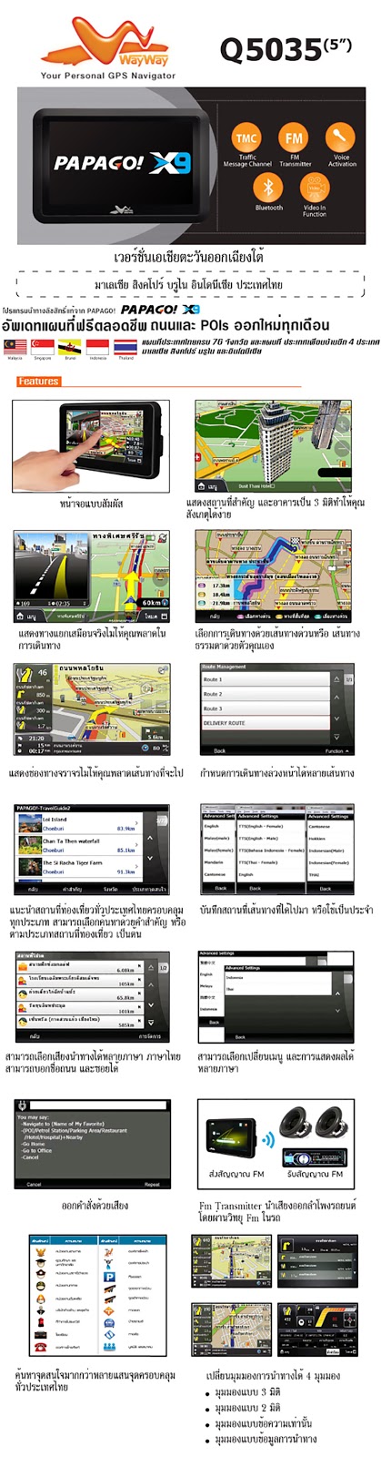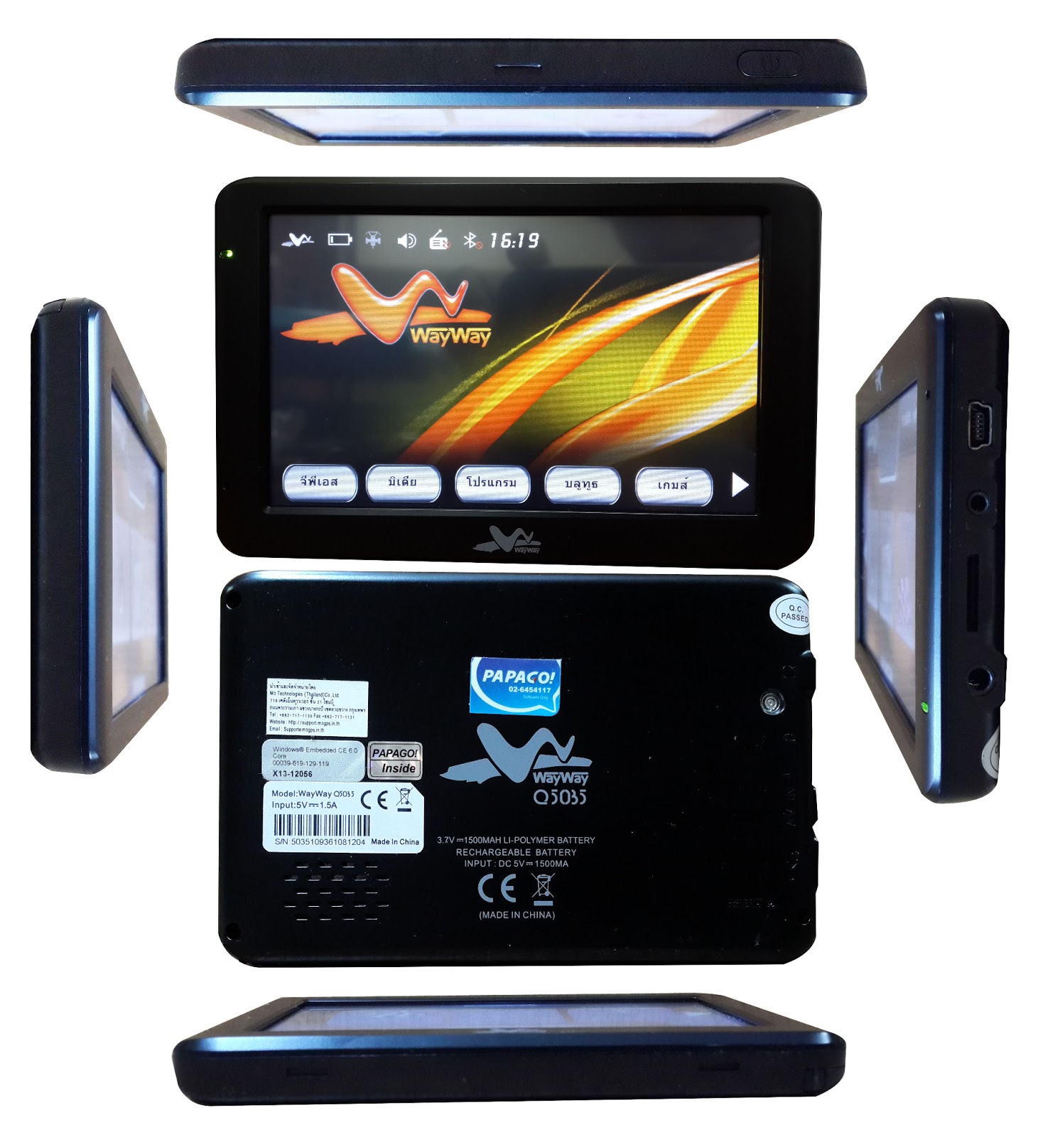 WayWay Q5035 เครื่อง GPS สุดฮอต กำลังมาแรง ด้วยความกว้างหน้าจอ 5 นิ้ว ขนาดและนำหนักกำลังเหมาะมือ งานประกอบกินขาดเครื่องแบรนด์ดังหลายตัว การค้นหาจุดหมายจากดาวเทียมหลายดวง ที่ทำให้การค้นหาเส้นทางและเป้าหมายเป็นไปด้วยความรวดเร็ว และระบบ Multimedia Function ที่ทำให้เพลิดเพลินไปกับความบันเทิงในการเดินทางของคุณไม่ว่าจะเป็นการดู หนัง ฟังเพลง หรือเล่นเกมได้ง่ายๆเพียงแค่สัมผัสที่หน้าจอ ด้วยความคมชัดระดับ TFT Color Touch Screen พร้อมรองรับการใช้งาน ด้วยเมนู ภาษาไทย