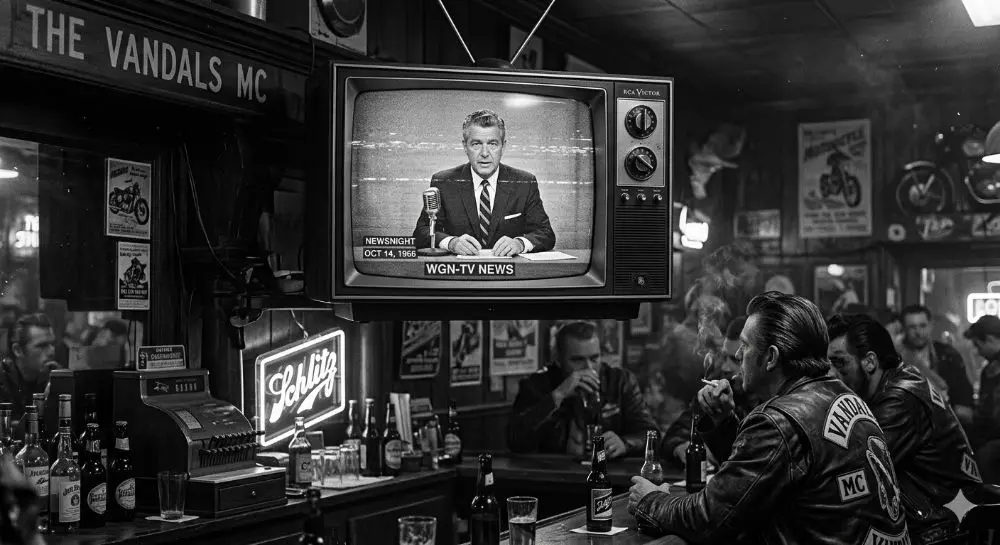 บนผนังเหนือเคาน์เตอร์บาร์ ทีวีเครื่องเก่ากะพริบภาพข่าวภาคค่ำที่ถูกเปิดทิ้งไว้โดยไม่มีใครสนใจ จนกระทั่ง...