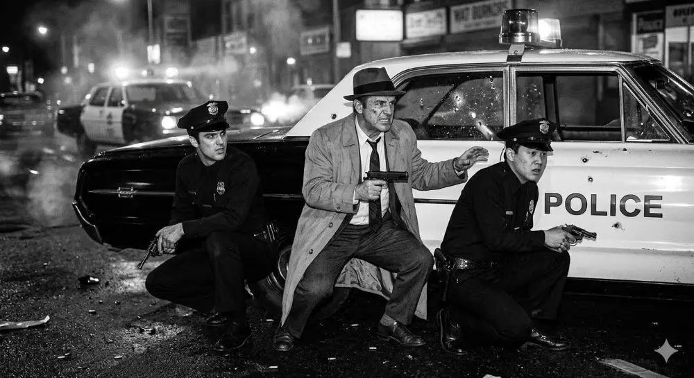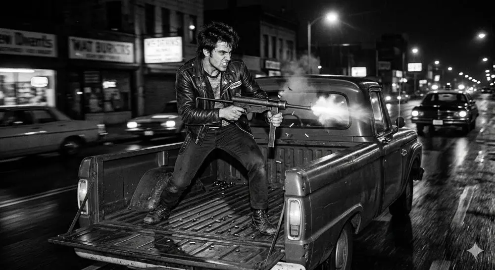 นักสืบที่กำลังจะขึ้นรถรีบกระชากปืนพกออกมาตามสัญชาตญาณ พยายามจะวิทยุขอกำลังเสริมด้วยมือที่สั่นเทา แต่เขากลายเป็นเป้านิ่งที่มือปืนบนรถกระบะเล็งไว้แล้ว ในมือของมันคือ M3 "Grease Gun" ปืนกลมือที่สาดกระสุนขนาด .45 ออกมาอย่างบ้าคลั่ง