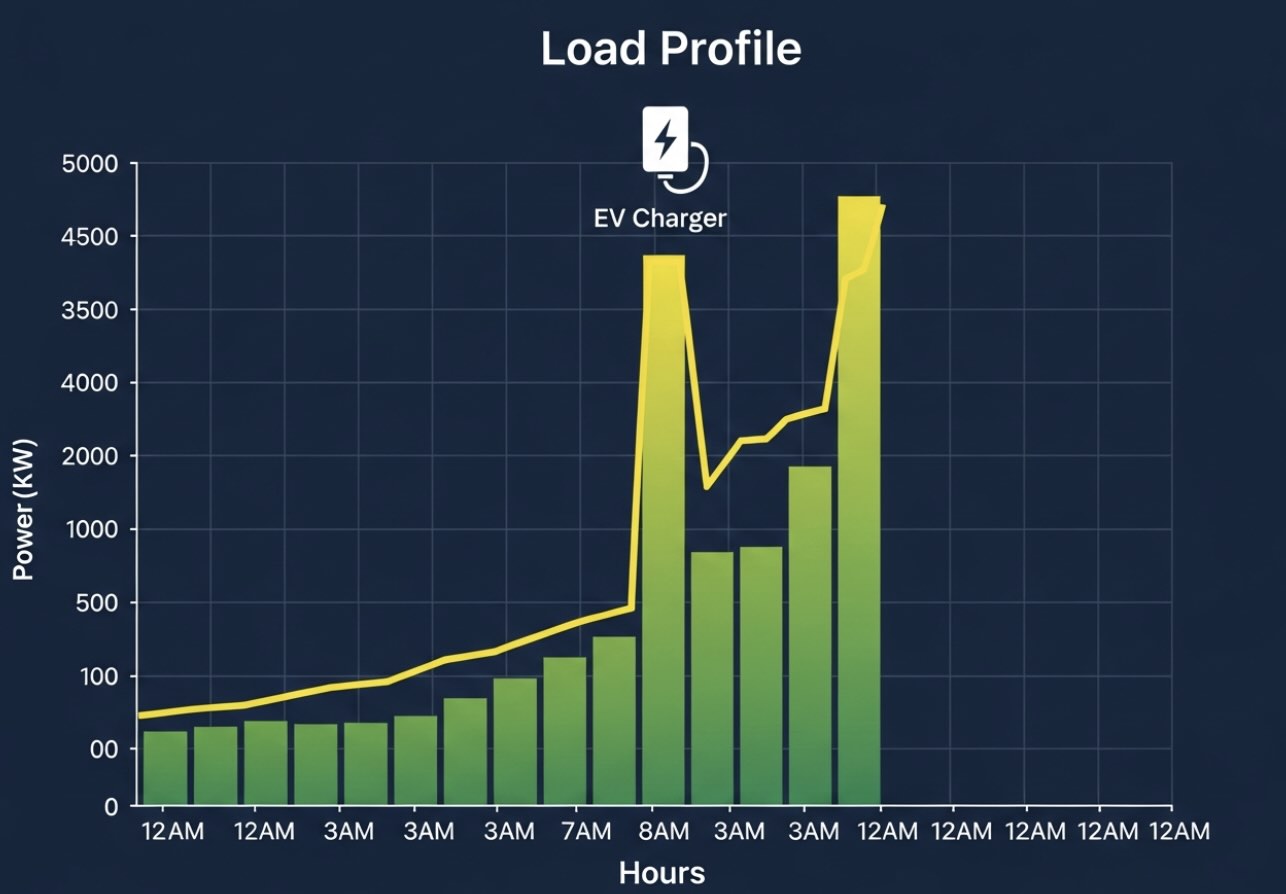 เครื่องจักรในโรงงานส่วนใหญ่มีรูปแบบการทำงานที่คาดเดาได้ แต่ EV Charger (โดยเฉพาะรุ่น DC Fast Charge) จะดึงพลังงานมหาศาลในระยะเวลาสั้นๆ หากรถผู้บริหาร 5 คัน กลับมาเสียบชาร์จพร้อมกันตอนบ่ายสามโมง ระบบไฟฟ้าของโรงงานอาจเจอกับ "Peak" ที่สูงขึ้นอย่างฉับพลัน ซึ่งไม่เพียงแต่จะทำให้ค่าไฟส่วน Peak พุ่งทะลุเพดาน แต่ยังอาจกระตุ้นให้ระบบป้องกัน (Breaker) ทำงาน และทำให้สายการผลิตหยุดชะงักได้