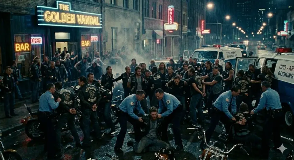 เสียงกุญแจมือสับดัง แกร๊ก! แกร๊ก! ท่ามกลางเสียงสบถด่าและความวุ่นวาย สมาชิก Vandals ถูกผลักขึ้นรถขนผู้ต้องขังอย่างไม่ปราณี