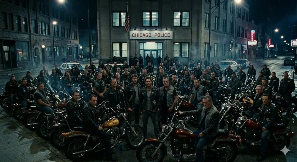 ตามฟุตบาทและลานจอดรถฝั่งตรงข้ามโรงพัก มอเตอร์ไซค์กว่า 100 คัน จอดเรียงรายกันเป็นตับ ทุกคันดับเครื่องยนต์สนิทและไม่มีการเปิดไฟหน้า มีเพียงแสงไฟจากเสาไฟฟ้าข้างทางที่สะท้อนกับถังน้ำมันเงาวับและเสื้อกั๊กหนังของเหล่าชายฉกรรจ์